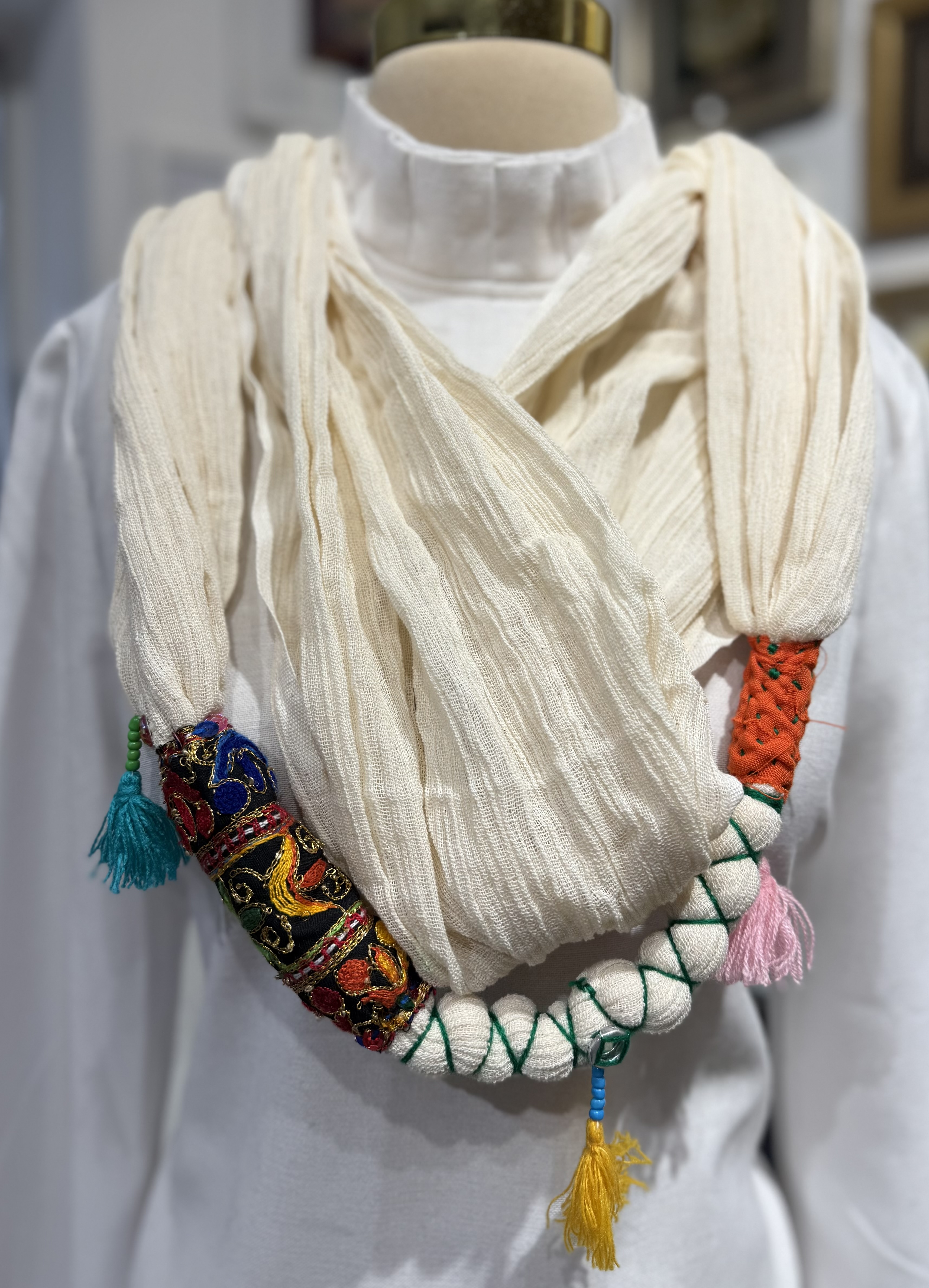 شال سفید الیاف طبیعی با سوزندوزی و آویزهای مختلف