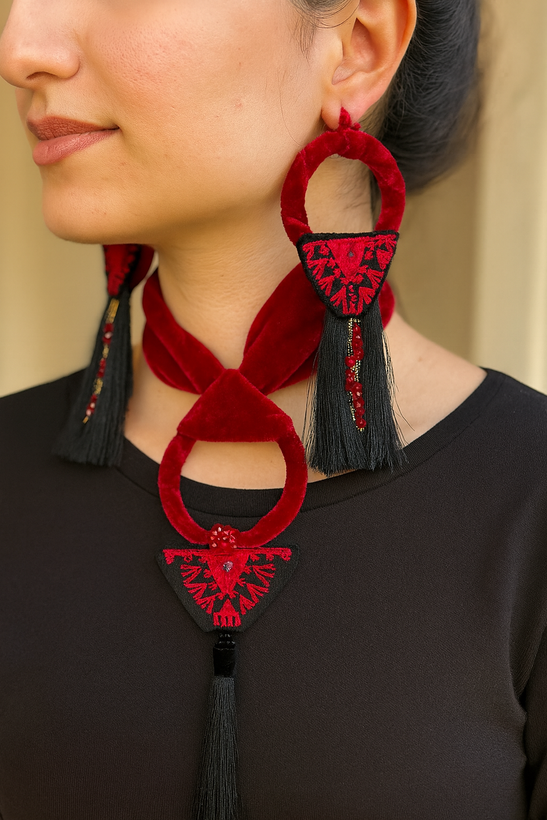 ست گوشواره و گردنبند یلدایی قرمز دستساز با سوزندوزی دستدوز تکنسخه