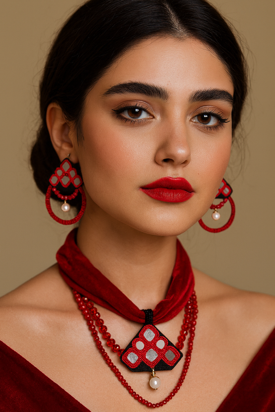 گوشواره وگردنبند قرمز یلدایی کاملا دستساز است وبا سوزندوزی دستدوز به صورت تکنسخه اجرا شده که سوزندوزیش توسط بانوان سیستان بلوچستان انجام شده .به صورت تکهم فروخته میشود .