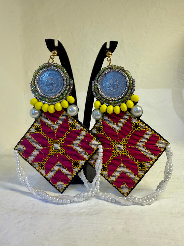 گوشواره دستساز و تکنسخه با سوزندوزی دستدوز ابریشم و مروارید و سکه