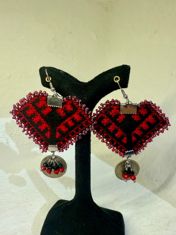 گوشواره دستساز با سوزندوزی دستدوز ابریشم منجوق دوزی شده با سکه وتکنسخه