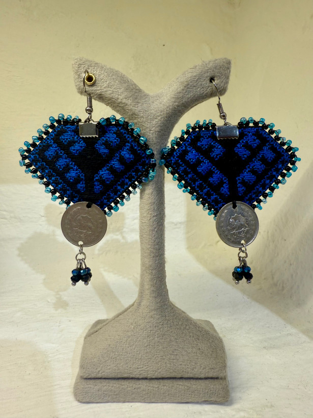 گوشواره دستساز تکنسخه با سوزندوزی دستدوز ابریشم و منجوق دوزی شده با سکه و تک نسخه