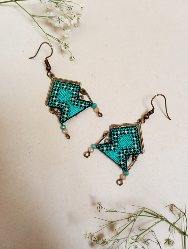 گوشواره دستساز تک نسخه با سوزندوزی دستدوز که توسط بانو بلوچدوخته شده است .