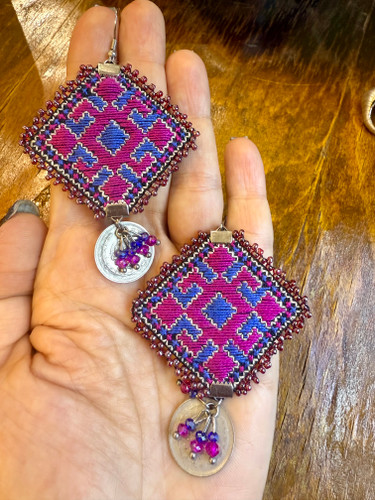 گوشواره کاملا دستساز خاص و تکنسخه با سوزندوزی دستدوز و مخمل و منجوق