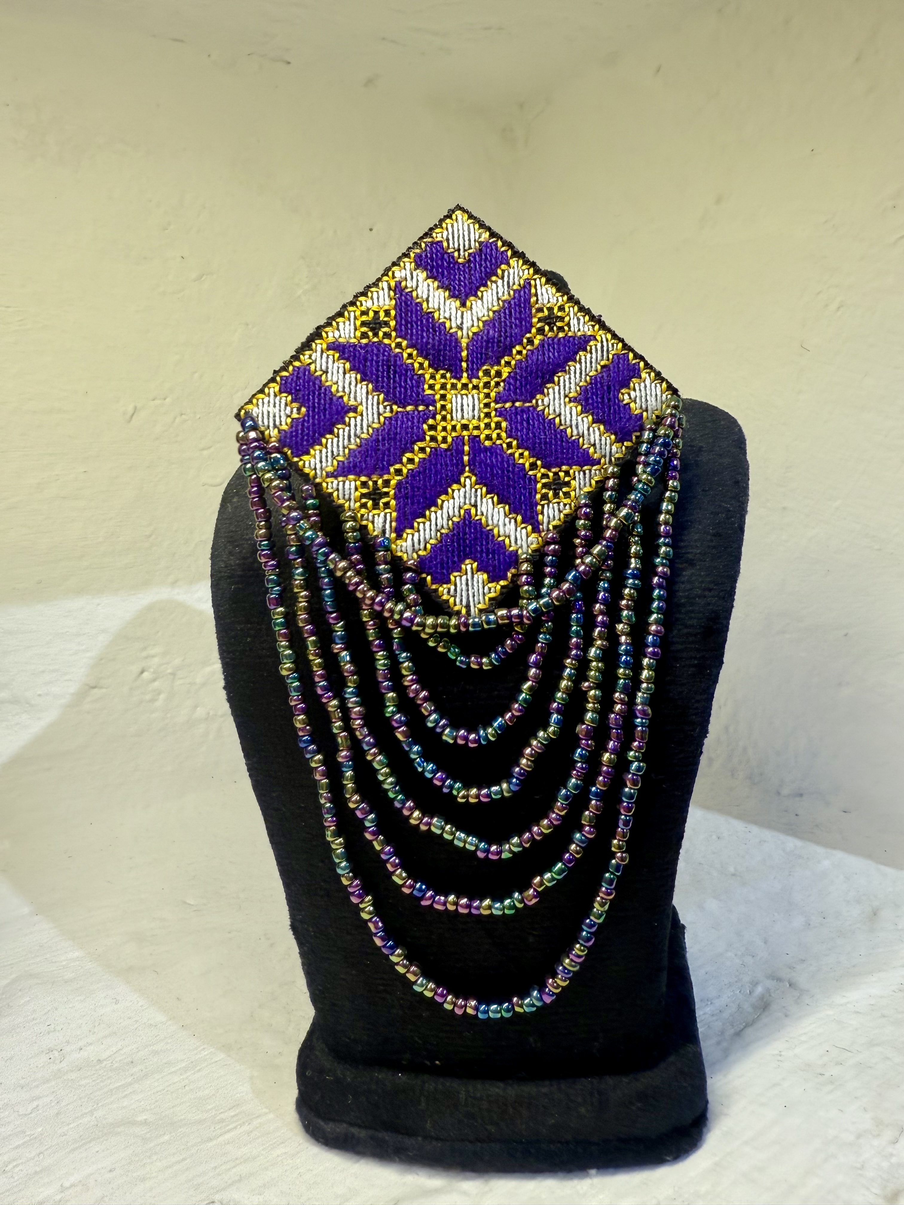 سنجاق سینه دستساز با سوزندوزی دستدوز ابریشم که توسط بانو بلوچ دوخته شده با سنگ و مروارید و تکنسخه