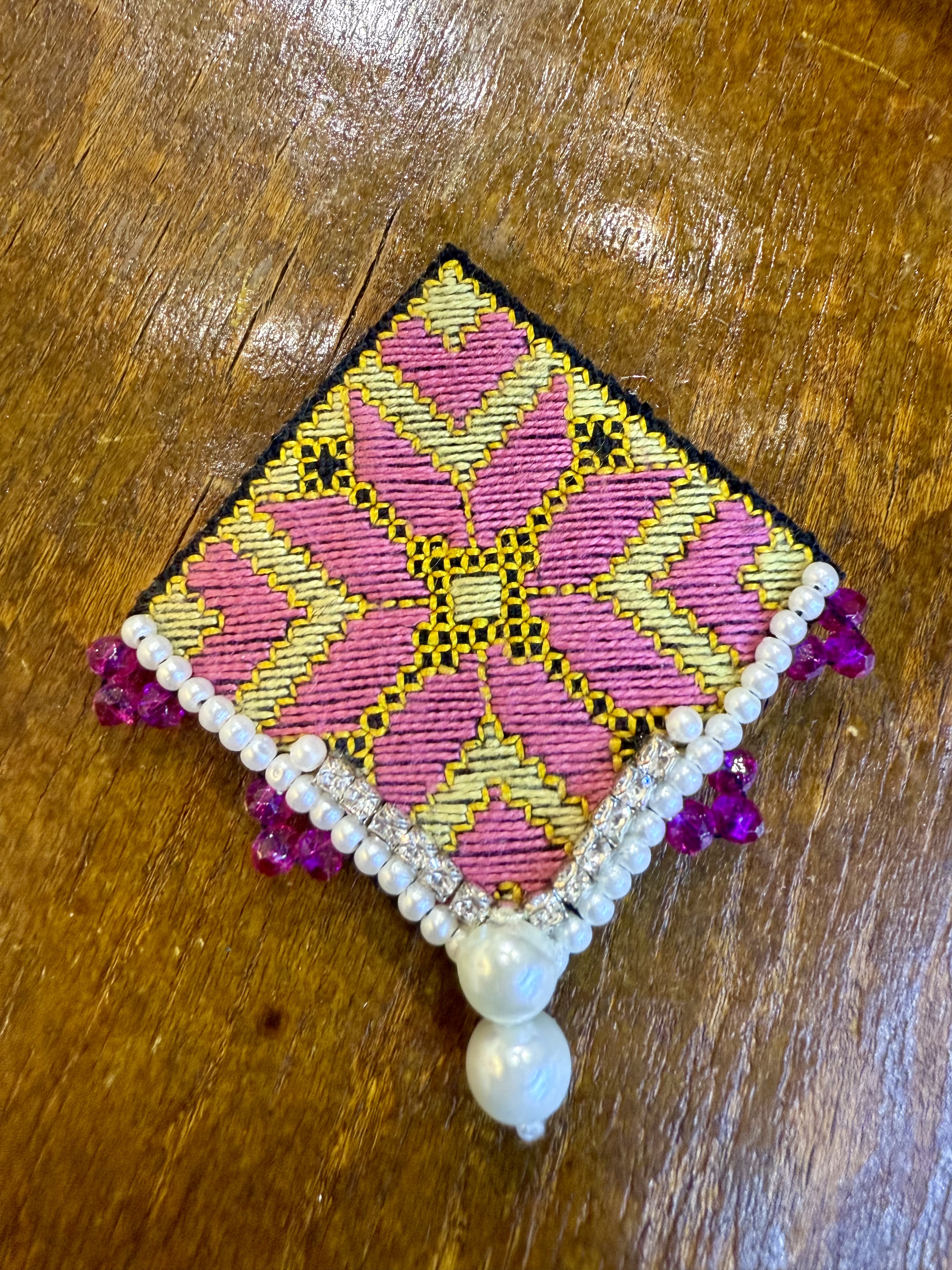 سنجاق سینه دستساز با سوزندوزی دستدوز و مروارید و منجوق و سنگ