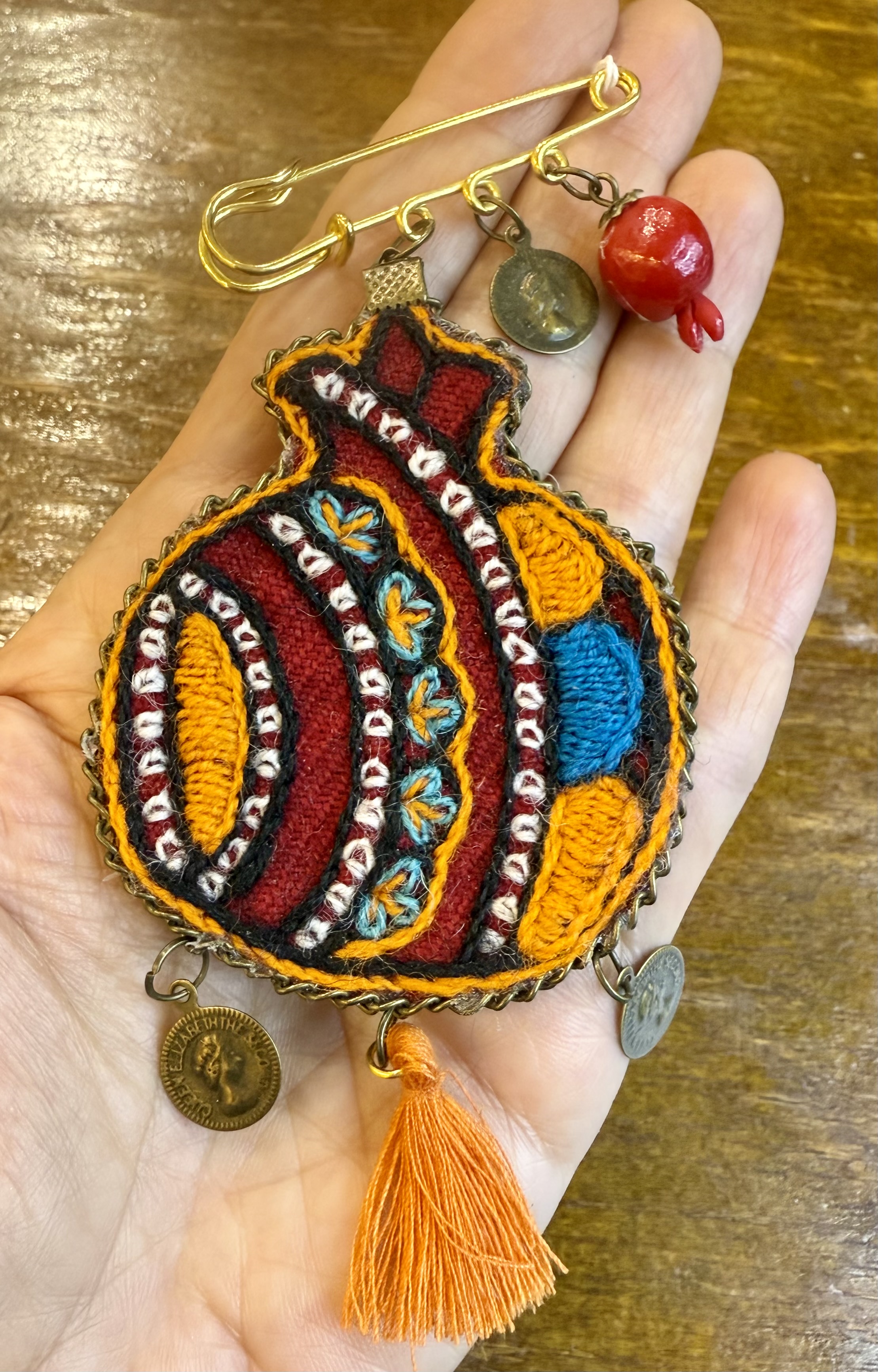 سنجاق سینه دستساز با سوزندوزی دستدوز و منجوق و سکه تکنسخه