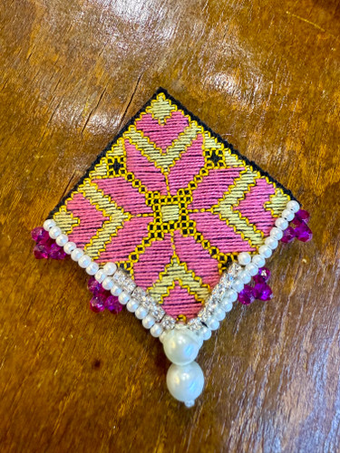سنجاق سینه دستساز با سوزندوزی دستدوز و مروارید و منجوق و سنگ