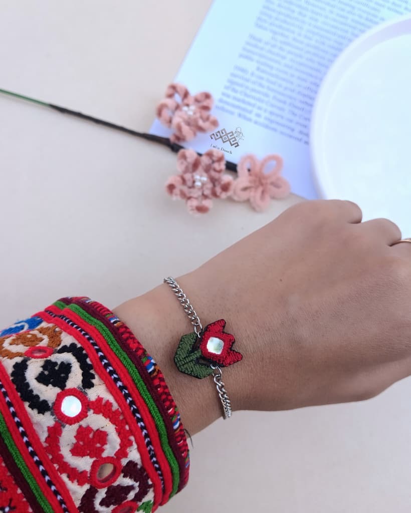 دستبند سوزندوزی دستدوز گل لاله استیل نقره ای رنگثابت و تک نسخه