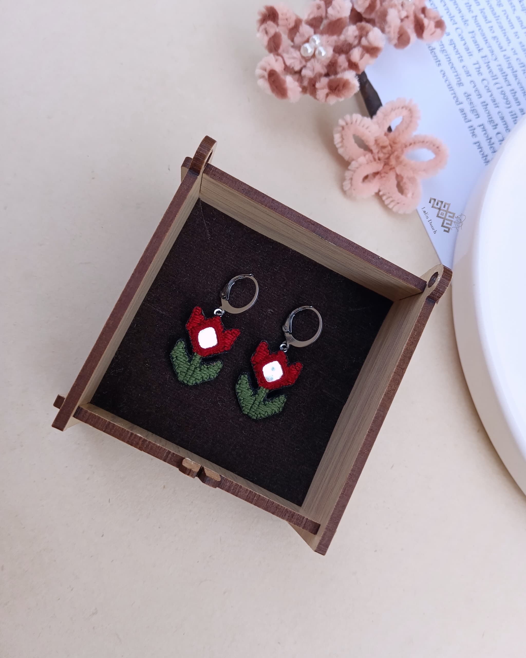 گوشواره سوزندوزی گل لاله استیل نقره ای رنگ ثابت و تک نسخه